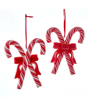 Kurt Adler's crisscross peppermint candy cane ornaments are a festive addition to your holiday décor or Christmas tree. Each ornament in this assortment features two red and white glittered candy canes in a crisscross design with a red glittered bow