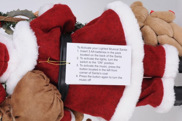 Our Lighted Musical Christmas Santa is great for any shelf, mantle, and countertop. The quality is unmatched with this decorative piece's hand-painted face, glass inset eyes, unique fabric, and detailed accessories. With his unique design, beautifully lit staff and gift bag, jovial banner and incredible detail, this traditional Christmas piece is sure to add character and style to any home. This Musical Santa plays Christmas carols with a push of a button. Songs include: Jingle Bells, We Wish You a Merry Christmas, Silent Night, Deck the Halls, Joy to the World, The First Noel, Hark the Harold Angles Sing, and O Christmas Tree. This item is battery operated. This piece requires 3 AA batteries.